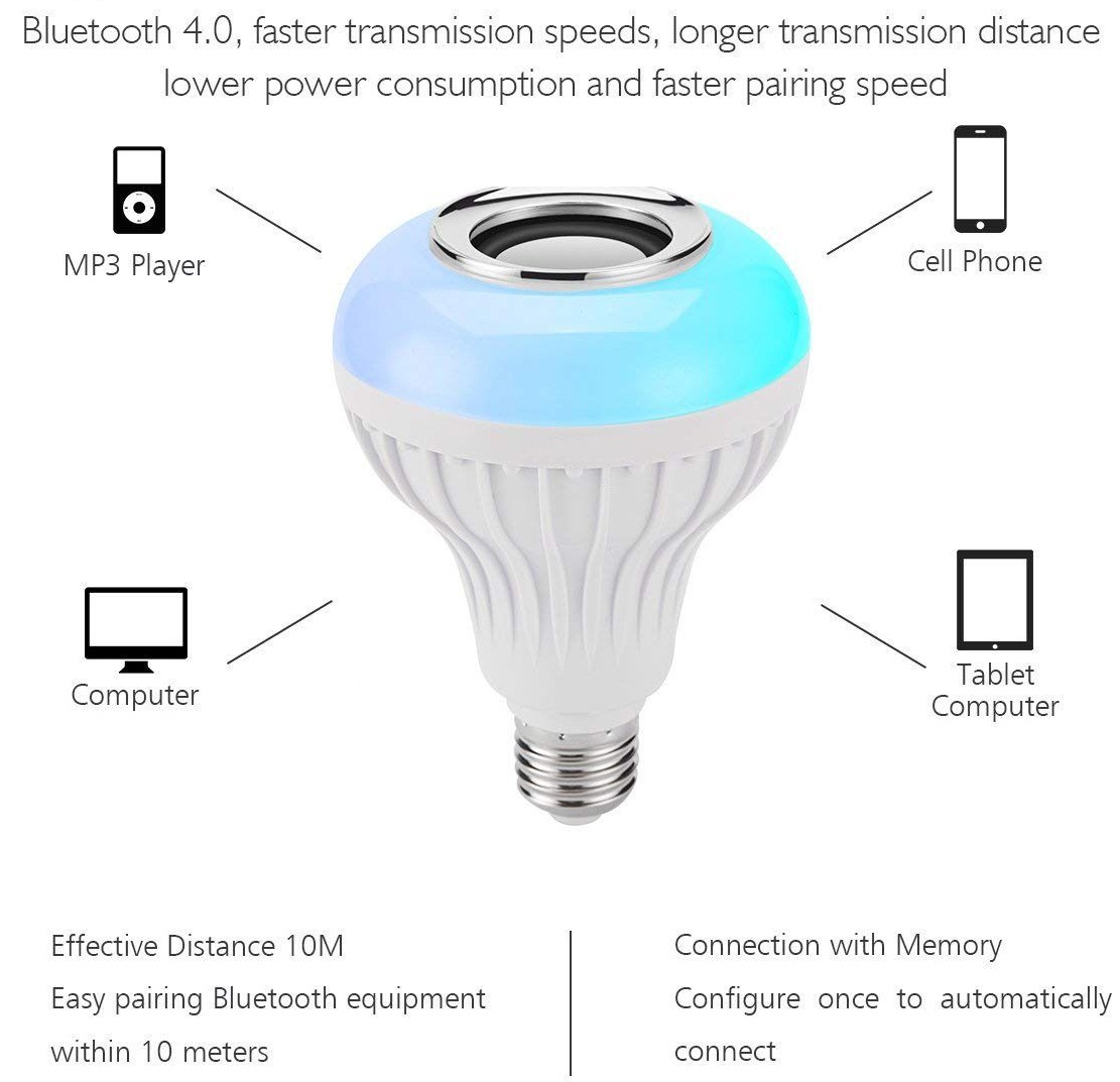 یکی از منحصر به فرد ترین قابلیت های این لامپ هفت رنگ و هوشمند نیز داشتن بلوتوث می باشد که با استفاده از آن می توانید اسپیکر لامپ را به گوشی خود وصل کنید و موزیک های مورد علاقه خود را پخش نمایید. لامپ موزیکال هوشمند همچنین دارای یک ریموت، جهت تنظیم صدای موزیک و تغییر رنگ نور لامپ نیز می باشد.