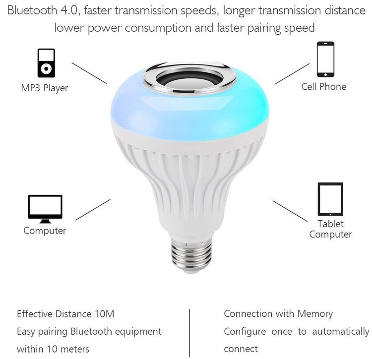 لامپ موزیکال دارای اسپیکر بلوتوثی به همراه ریموت حبابی شکل، علاوه بر نور دهی با رنگ های مختلف قادر به پخش موزیک نیز می باشد. برای استفاده از این لامپ هوشمند نیازی به سیم کشی جدید و یا خرید سر پیچ های خاص ندارید زیرا این لامپ علاوه بر ظاهر جذاب، دارای سرپیچ E27 می باشد که به راحتی بر روی سر پیچ های موجود در خانه ها قابل نصب است. همچنین این محصول با وجود کارایی فوق العاده بسیار کم مصرف می باشد.